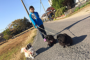 突然、椎間板ヘルニアで動けなくなったふく&ロンちゃん。投薬と約1ヶ月の安静によりようやく復活。ファミリー全員が心配していただけにホントひと安心だ。久しぶりの散歩に大興奮のふく&ロン。特にロンは、何で散歩に連れて行ってくれないのぉ〜?と1ヶ月ずーっと訴えていただけに、まだ短い散歩コースだがもう超ご機嫌。これだけ元気になれば安心だ。良かった良かった。 |