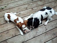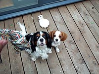 | 私メルちゃん、毎日バカ旦那のミ−と遊んでます。でも私の方が断然強いのよ。今日もパパが大好きなヒモでミ−と遊んでたの。急に私も欲しくなってミ−のとっちゃった。そうしたら、驚き!パパが私のこと怒るのよ。おてんば過ぎるんだって!だってほしいんだもん。捕られるミ−が悪いのよ。でも怒られたのでちょっとすねてみたら、案の定パパ許してくれたわ。作戦勝ちね! | ||