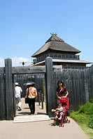 | 佐賀市からお隣の神埼郡へ。あの有名な「吉野ケ里遺跡」の吉野ヶ里歴史公園へきました。歴史的な発見として全国的にニュースとして流れ、その名は皆さんご存じだと思います。我々も実は名前はもちろん良く知っているし、弥生時代の集落が復元されていると言うことくらいは聞いていたが、それ以上のことは恥ずかしながら知りませんでした。もちろん歴史好きなパパは、けっこう細かいこと知っておりましたが、それでも場所や現況など知らないことばかりやはり1度は見ておこう!ということになりました。まぁ〜本当は、佐賀市街近郊で子供たちが喜びそうなスポットがない?ということが1番の理由ではあったのですが・・・。ところが着くや驚き!すごい規模だ。 | ||