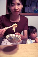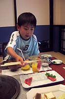 | 佐賀牛はまだ知る人ぞ知るという高級和牛だ。全国的に見るとブランド力はまだ関西までかもしれない。よく知られていることではあるが、ブランド力が弱い和牛はよりブランド力のある地へ売られ名をかえて世に出まわる。有名なのは山形の米沢牛や岩手の前沢牛は神戸へと渡り、神戸牛として世に出る。近年認められるようになってきた佐賀牛も多くが松坂牛として世の食通のもとへ届けられる。こういった流通システムは???で仕方ないが、牛とてやはりブランドには勝てないのである。話は逸れたが、早速鉄板で野菜ともども、その佐賀牛ロースを焼く。そして口にする。やはり言葉が見つからない。佐賀牛自慢の目のつまった霜降り。正直感動ものだ。結局、良太くんもパパの肉を奪い取る。 | ||