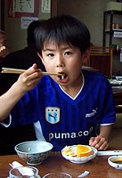小川のせせらぎ聞きながら、美しいライトブルーのツルツル湯に貸し切りで入る。あぁ〜ホント贅沢で至福の時である。ちなみに2つある貸し切り風呂は無料で時間制限なく24時間利用できる。入り口の入浴中の札をかけて入るシステムだ。いやぁ〜ここせせらぎの湯はホントお気に入りの湯になった。とりあえずここは暗くなっても良いだろうが、明るいうちに入ってそのシチュエーションを楽しんでもらいたい湯と言えそうだ。さっぱりした後はいよいよ夕食だ。楽しみ〜!ところがここでアクシンデント発生!着替えて部屋に戻る途中、良太くんの首筋に立派な毛虫が・・・もちろんチクチクされて痛かゆい〜!可哀想についていない。帰りに運悪く毛虫が降ったらしい。半べそ良太くん、美味しい夕食で機嫌をなおしてちょうだい! |