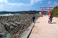 水が完全にひいてしまうので、鬼の洗濯板の上をずーっと歩いていける。洗濯板の先端までいくと、そこは日向灘の荒波がバンバン打打ち寄せてくる。すごい迫力!早速キッズたちは綺麗な貝殻探しをスタートするものの、満ち引きが早いためか?貝殻は全然ない。その分ヤドカリがいっぱい。キッズたちに冗談で、「ここで鬼が洗濯するんだよ?」と話すと真剣モードに。宮崎は鬼はないが、神話がいっぱいの国。聖なる地なのだ。青島神社に祀られてる日子穂穂手見命は、「山幸彦」として親しまれており、「海幸彦 山幸彦」の神話はここ青島海岸が舞台になっているそうです。 |